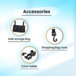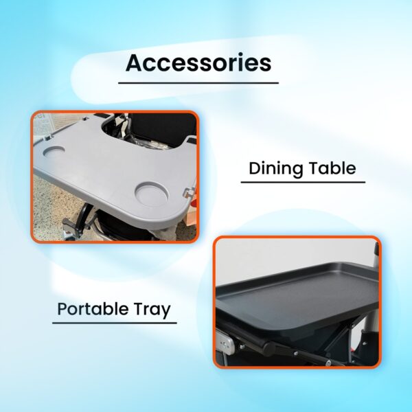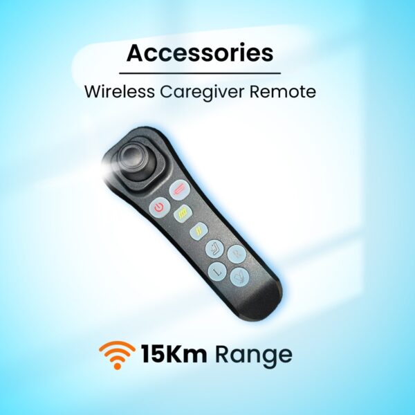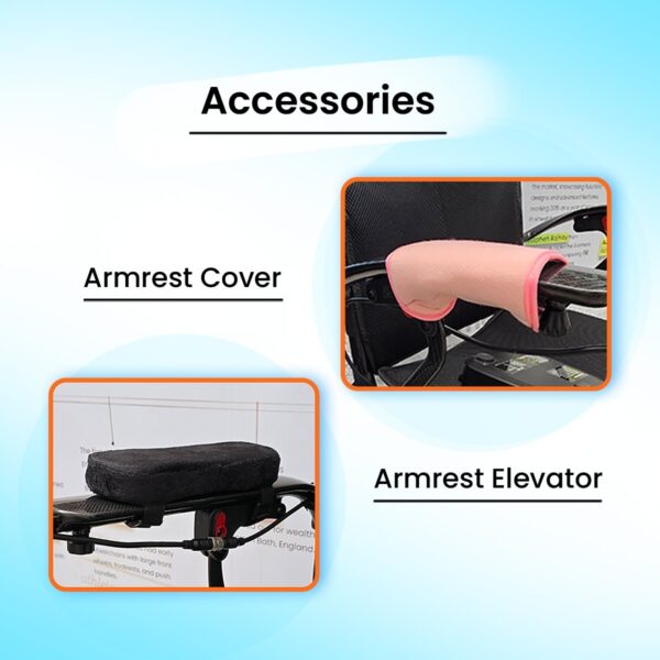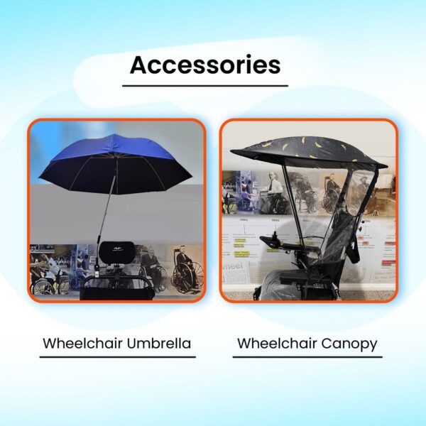 Accessories | 1- Wireless Caregiver Remote (15m Range) 2- Safety Flag 3- Cane holder 4- Side storage bag 5- Padded armrest cover 6- Shopping bag hooks 7- Wheelchair portable tray 8- Dining table 9- Wheelchair cushion 10- Wheelchair Umbrella 11- Wheelchair Leg Strap Restraints 12- Phone & Tablet Holder 13- Bottle Holder 14- Wheelchair Canopy 15- Armrest Elevator |