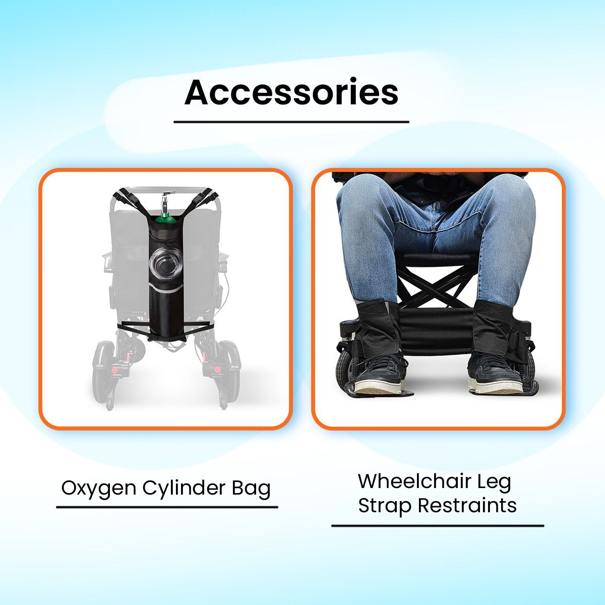 Accessories | 1- Wireless Caregiver Remote (15m Range) 2- Safety Flag 3- Cane holder 4- Side storage bag 5- Padded armrest cover 6- Shopping bag hooks 7- Wheelchair portable tray 8- Dining table 9- Wheelchair cushion 10- Wheelchair Umbrella 11- Wheelchair Leg Strap Restraints 12- Phone & Tablet Holder 13- Bottle Holder 14- Wheelchair Canopy 15- Armrest Elevator |