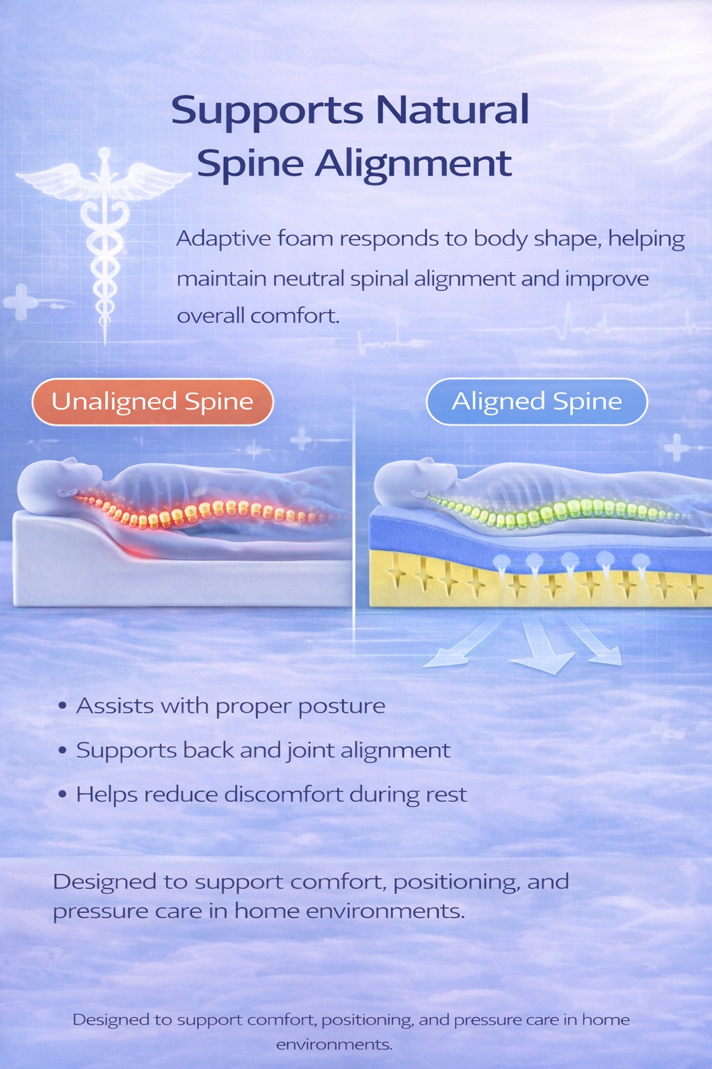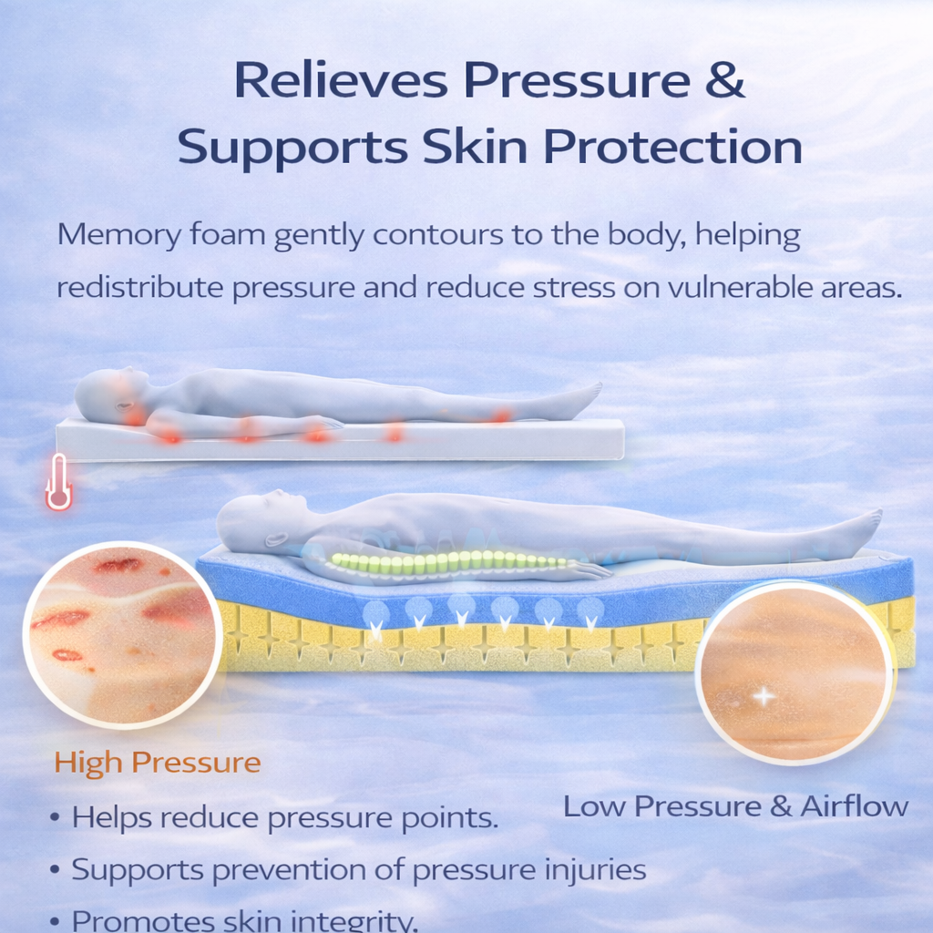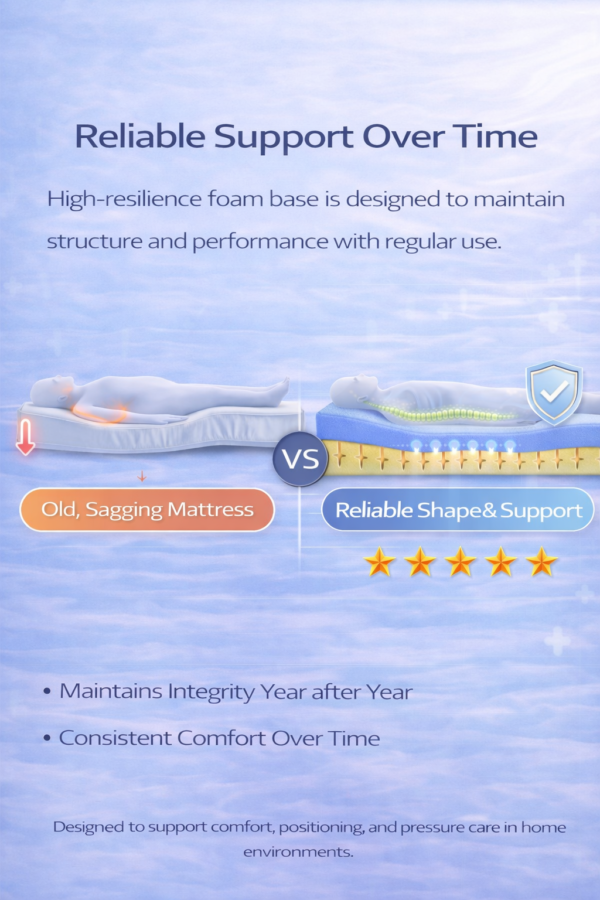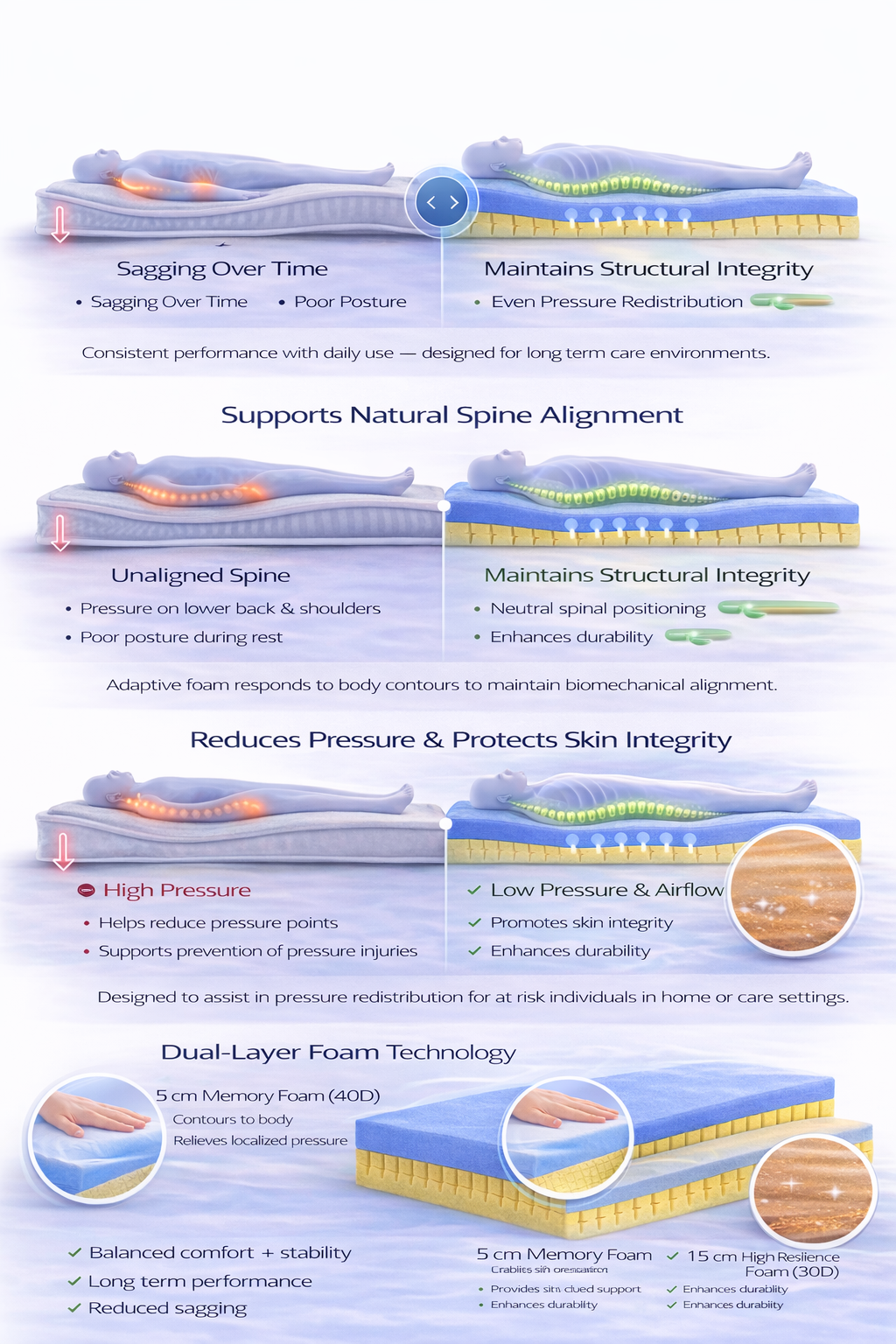 Functional Benefits | · Provides pressure redistribution and comfort support · Enhances airflow and temperature regulation · Maintains stability on adjustable beds · Supports daily use in home care and aged care settings |