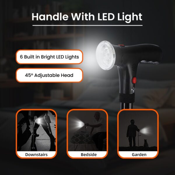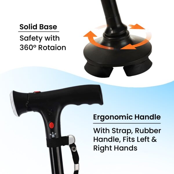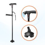 This folding walking stick is made from lightweight yet sturdy aluminum alloy, so it’s strong without feeling heavy. It comes with practical features like an adjustable LED light for better visibility, an SOS alarm for emergencies, and ergonomic dual handles for extra comfort.